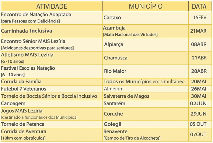 De lembrar que o MAIS Lezíria foi criado em 2011 e nasceu da vontade da CIMLT e dos seus onze Municípios associados - Almeirim, Alpiarça, Azambuja, Benavente, Cartaxo, Chamusca, Coruche, Golegã, Rio Maior, Salvaterra de Magos e Santarém - em reunir toda a população da Lezíria do Tejo num grande convívio desportivo, incentivando a participação de todos, incluindo as crianças, os idosos e as pessoas com deficiência.