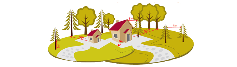 De acordo com o estabelecido no Decreto-Lei n.º 124/2006 de 28 de junho, considerando a sua atual redação, nomeadamente no contemplado nos pontos 2 e 10 do artigo 15.º, os terrenos confinantes a edifícios inseridos em espaços rurais e, os aglomerados populacionais inseridos ou confinantes com espaços florestais, devem estar livres de combustível numa faixa de largura não inferior a 50m [medida a partir da alvenaria exterior do edifício] ou numa faixa exterior de proteção de largura mínima não inferior a 100 metros, respetivamente.