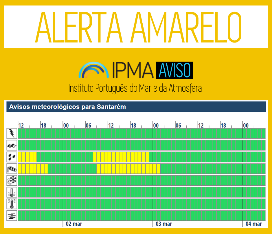 O Instituto Português do Mar e da Atmosfera determinou Aviso Amarelo para o Distrito de Santarém: Precipitação e Vento.
