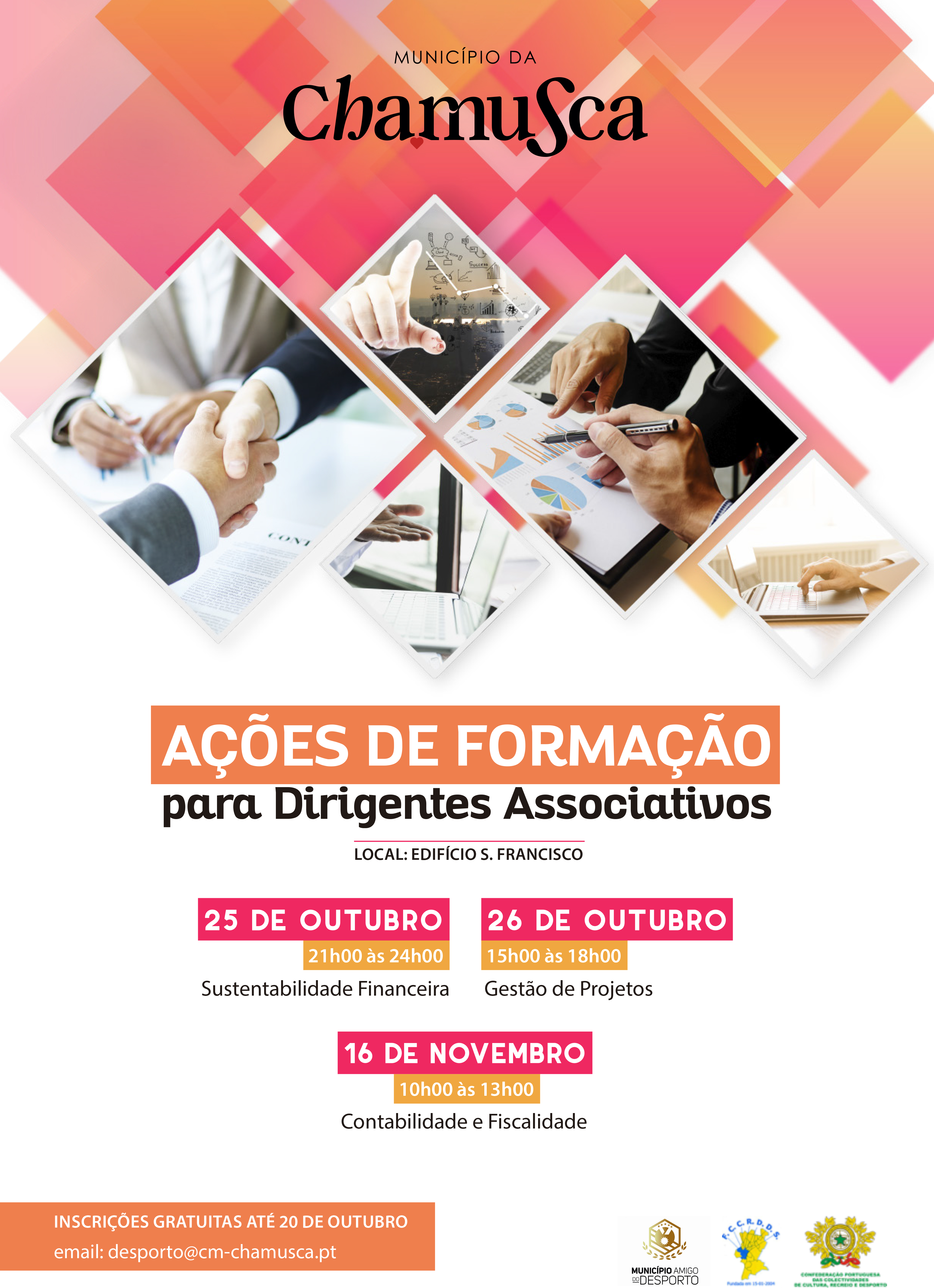 O Município da Chamusca, em parceria com a Federação das Coletividades de Cultura, Recreio e Desporto do Distrito de Santarém e com a Confederação Portuguesa das Colectividades de Cultura, Recreio e Desporto, promove um conjunto de ações de formação para dirigentes associativos.