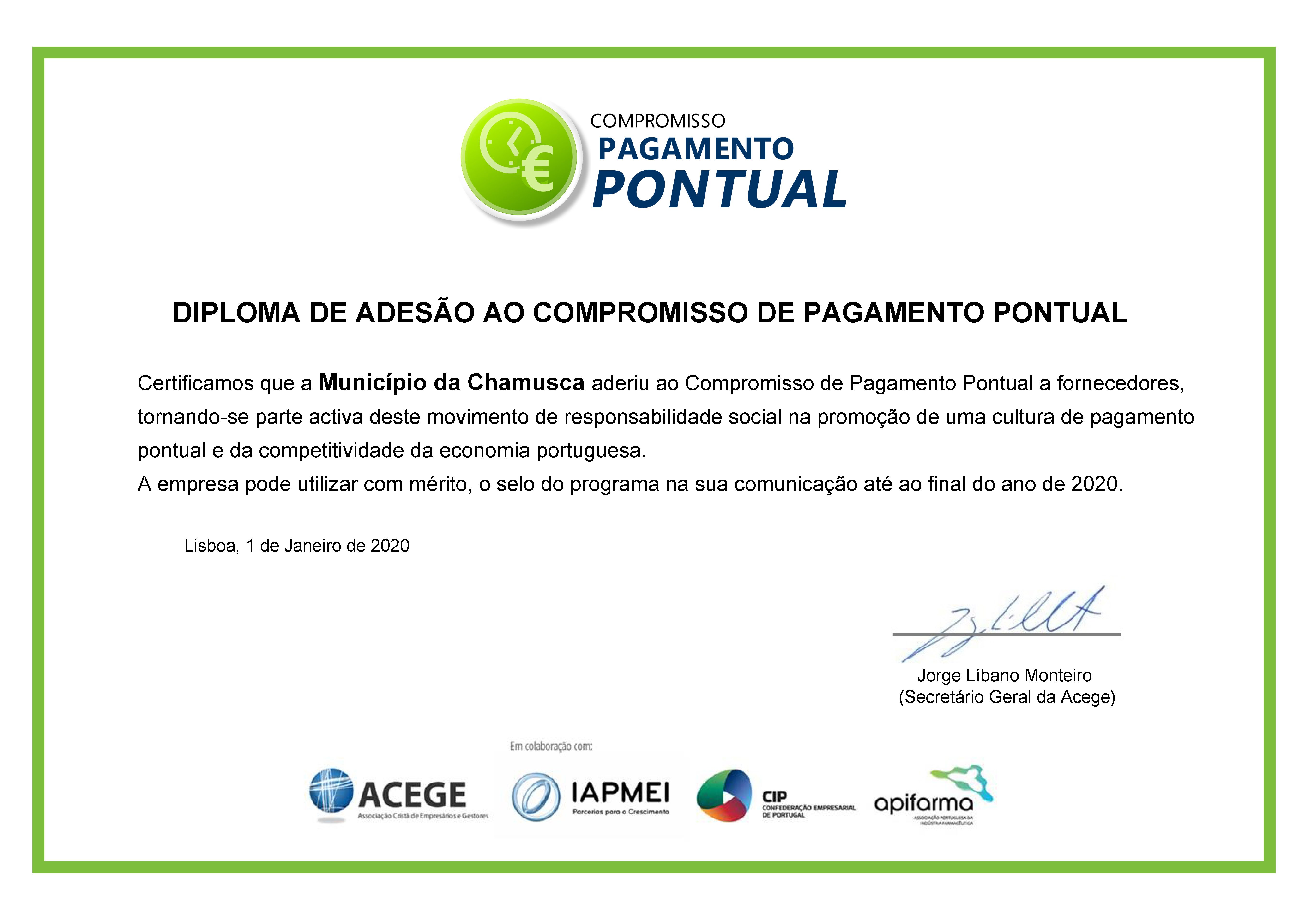 “É com a maior alegria e satisfação que, por indicação dos presidentes da ACEGE, IAPMEI, CIP e APIFARMA, enviamos o diploma de membro do Compromisso de Pagamento Pontual 2020 e o selo do programa que poderá usar na comunicação da sua empresa”, refere coordenador do Compromisso Pagamento Pontual, o secretário-geral da ACEGE, Jorge Líbano Monteiro.