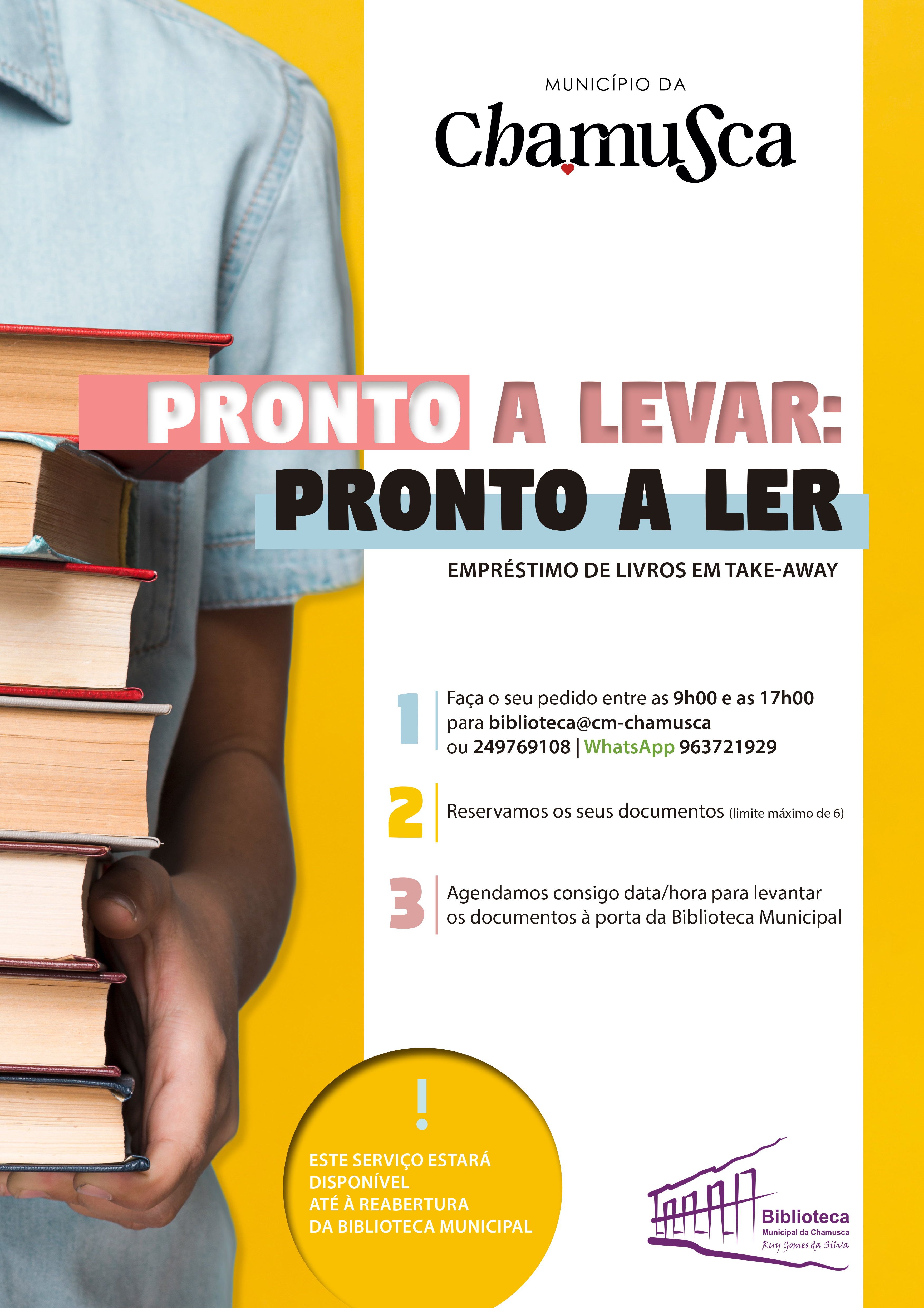 O serviço chama-se “Pronto a levar: pronto a ler” e disponibiliza o empréstimo domiciliário, em regime take-away dos livros, revistas e dvd’s que fazem parte do acervo da Biblioteca Municipal da Chamusca. O utilizador só tem de contatar a Biblioteca através de e-mail (Este endereço de email está protegido contra piratas. Necessita ativar o JavaScript para o visualizar.), telefone (249769108) ou WhatsApp (963721929) e fazer a reserva dos documentos que pretenda levar para casa, num máximo de até 6 documentos em simultâneo.