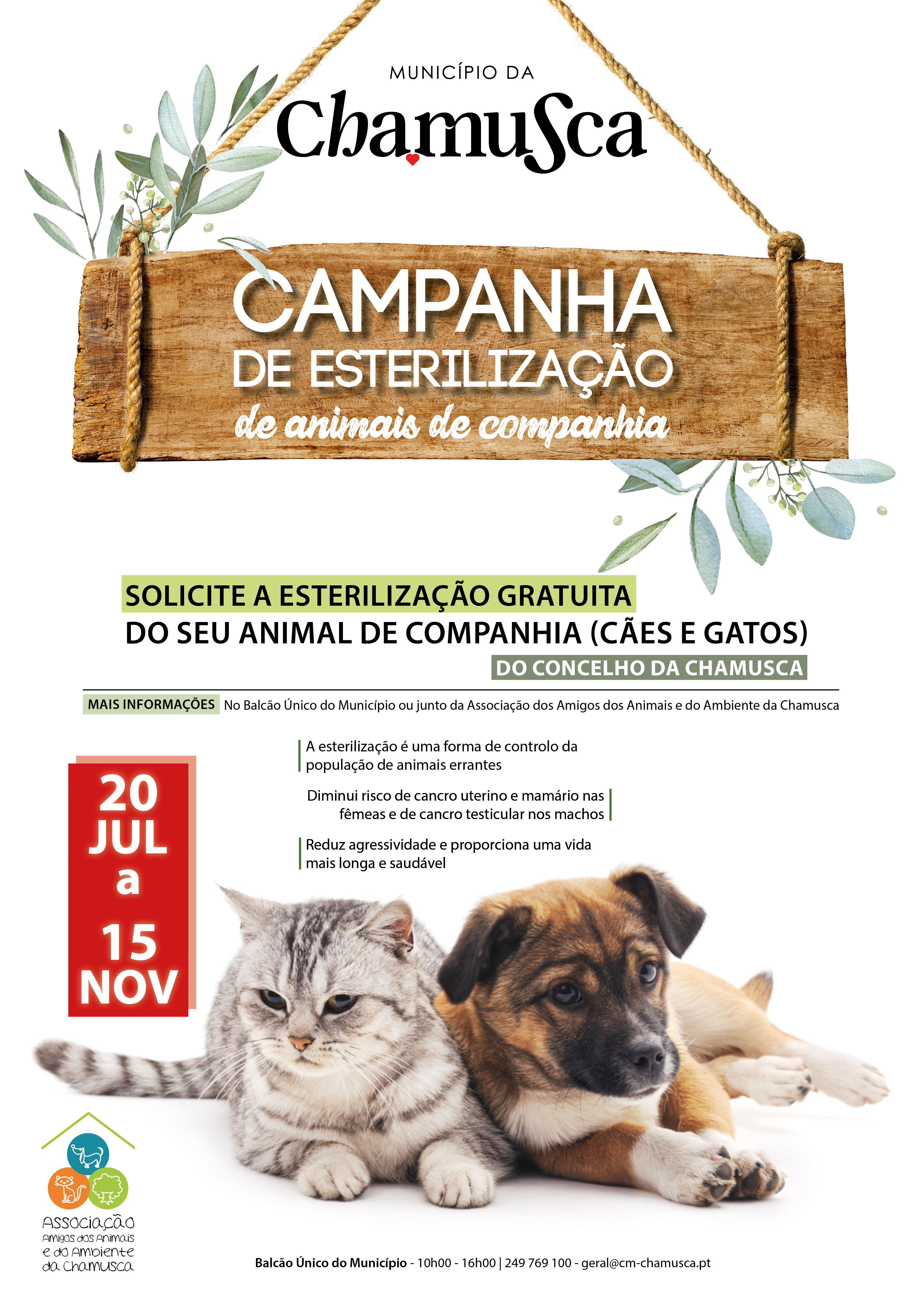 O Município da Chamusca continua a promover a campanha de apoio à esterilização de cães e gatos domésticos, como forma de controlo da população de animais errantes e de eliminar o recurso à eutanásia.