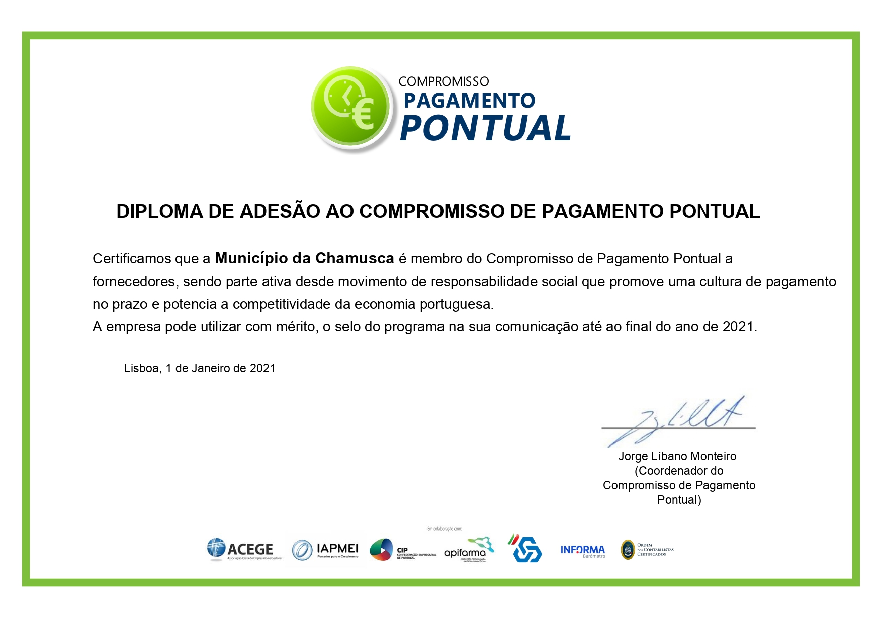 O Município da Chamusca recebeu, pelo terceiro ano consecutivo, o diploma que confirma a adesão ao selo “Compromisso Pagamento Pontual”, conferido pela ACEGE - Associação Cristã de Empresários e Gestores (ACEGE), IAPMEI, CIP, OCC e APIFARMA, e após a análise técnica da Informa D&B.