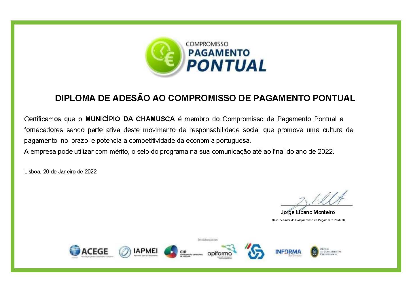 Este diploma certifica que o Município da Chamusca assume e cumpre a responsabilidade do pagamento aos seus fornecedores dentro dos prazos estipulados, contribuindo para uma economia sustentável.