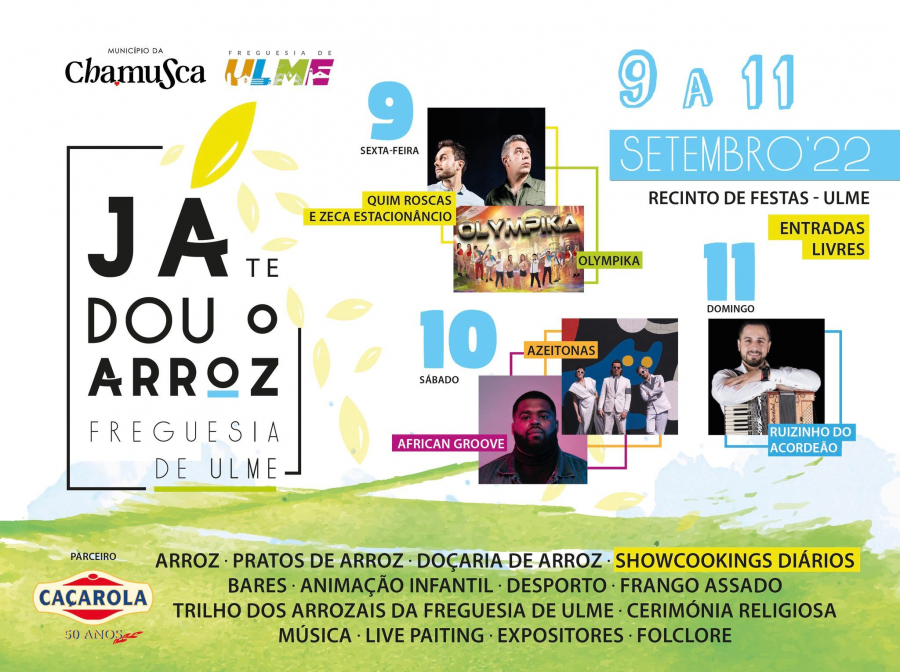 A vila de Ulme recebe, de 9 a 11 de setembro, o evento “Já Te  Dou  o  Arroz”,  um  certame  dedicado  a  promover  o  arroz, um produto endógeno e tradicional da freguesia, onde existem vastas extensões de arrozais e onde esta planta é a fonte de riqueza para muitas famílias.