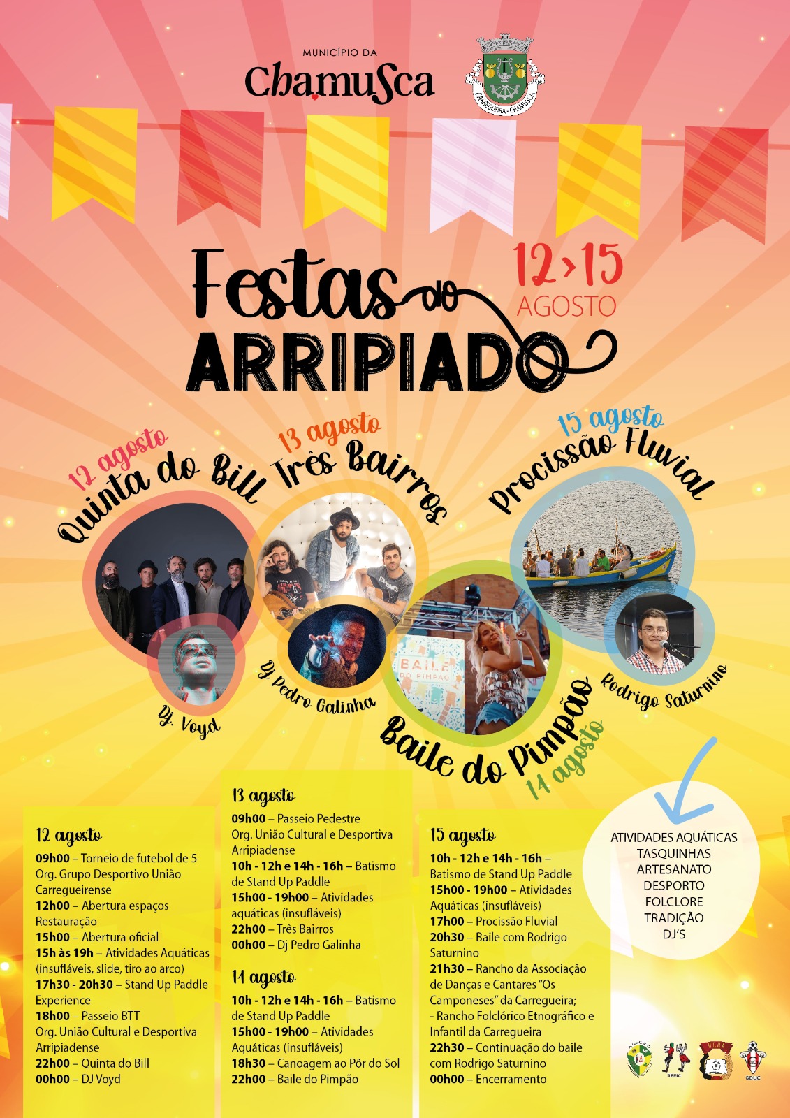 No cartaz musical, destaque para os concertos de Quinta do Bill (amanhã às 22H00), Três Bairros (13 de agosto, às 22H00) e Baile do Pimpão (14 de agosto, às 22H00). A festa continua pela noite dentro com bastante animação e com a presença do Dj Voyd e Dj Pedro Galinha, respetivamente amanhã (12 de agosto) e domingo (13 de agosto) a partir da meia-noite.