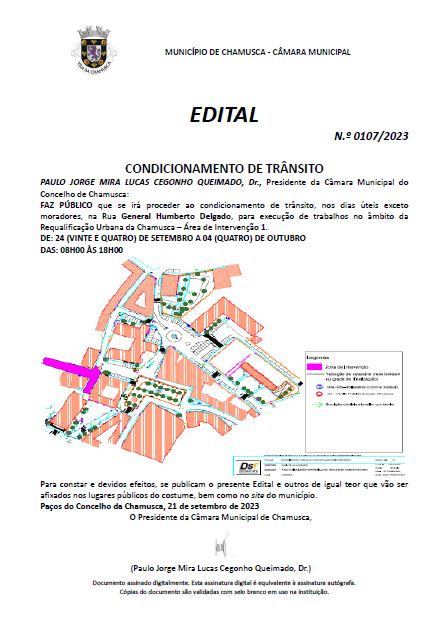 No âmbito da execução dos trabalhos da empreitada "Requalificação Urbana da Chamusca - Área de Intervenção 1" será necessário proceder ao Condicionamento de Trânsito, até ao dia 04 de outubro de 2023, na Rua General Humberto Delgado, no dias úteis entre as 08h00 e as 18h00, sendo apenas permitida a circulação a moradores.