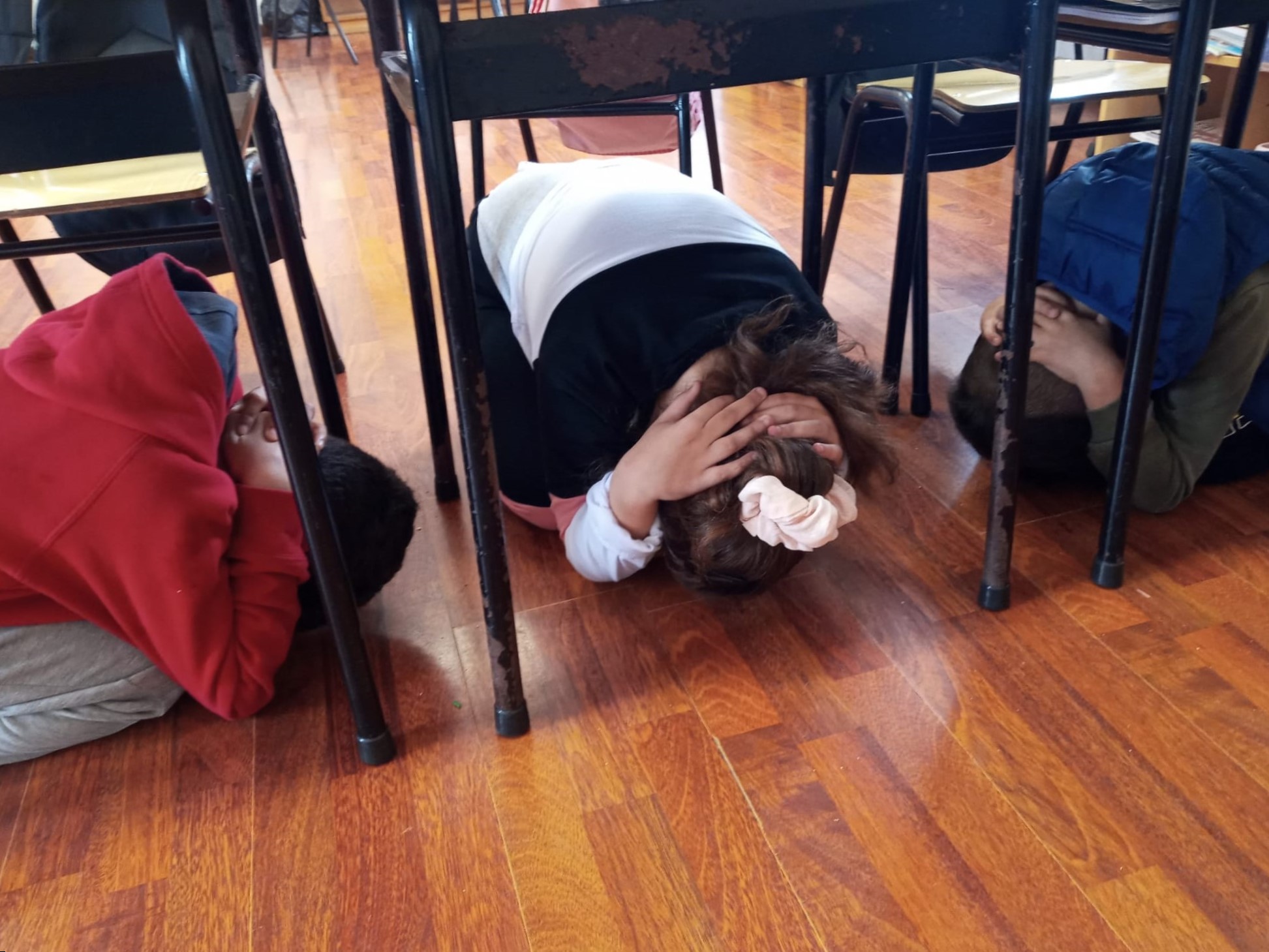 O exercício teve a duração de um minuto, durante o qual os participantes executaram os três gestos que podem salvar vidas: BAIXAR, PROTEGER E AGUARDAR.