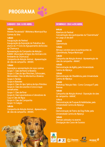 Nos dias 13 e 14 de abril decorre o PetFest - 1º Festival Animal da Chamusca. A par do evento, decorre uma campanha de adoção animal promovida pelo Município em parceria com a Associação Amigos dos Animais e Ambiente da Chamusca.