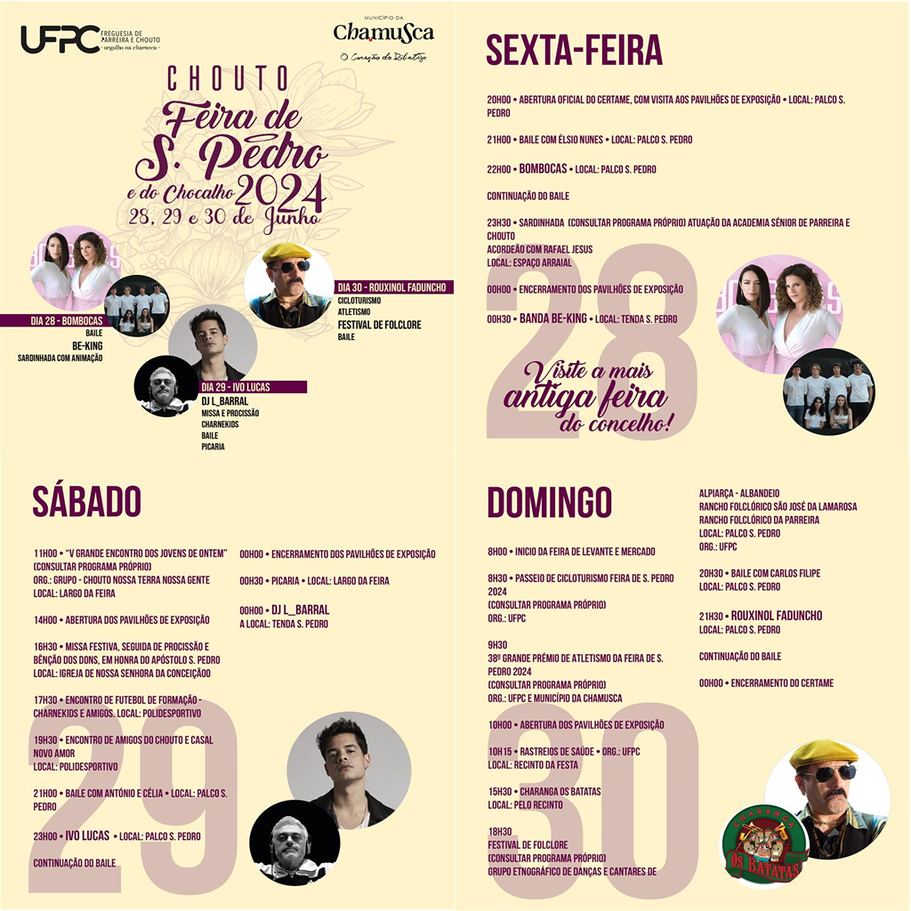 Bombocas, Ivo Lucas e Rouxinol Faduncho prometem animar as três noites da Feira de S. Pedro e do Chocalho, onde não vão faltar ainda espetáculos de música, exposições, atividades desportivas, hípicas e taurinas, gastronomia, folclore, mostras de artesanato e de produtos locais, animação e sobretudo cultura e tradição.