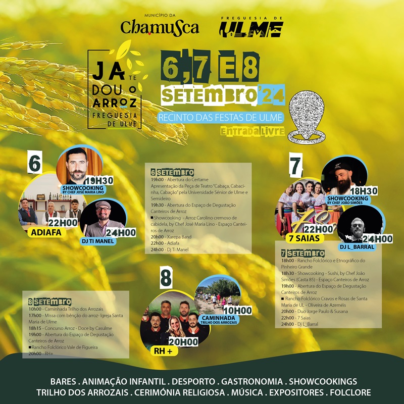 Durante três dias, o recinto de festas de Ulme será palco de diversas atividades, entre as quais a confeção e apresentação de pratos e doces à base de arroz, sessões de showcooking, uma caminhada pelo trilho dos arrozais, atividades desportivas, missa com a bênção do arroz, e ainda muita música, folclore, cultura e animação.