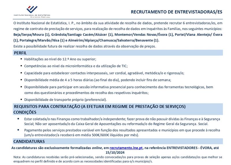 O Instituto Nacional de Estatística, I. P., no âmbito da sua atividade de recolha de dados, pretende recrutar 6 entrevistadoras/es, em regime de contrato de prestação de serviços, para realização de recolha de dados em Inquéritos às Famílias, nos seguintes municípios: