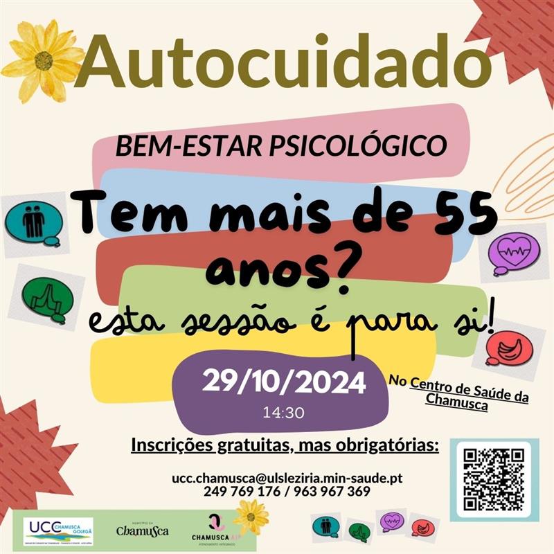 No próximo dia 29 de outubro, pelas 14h30, no âmbito das comemorações do Dia Mundial da Saúde Mental, celebrado a 10 de outubro, a UCC Chamusca/Golegã conta com a colaboração do Município da Chamusca na dinamização de uma sessão intitulada de " Autocuidado – Bem-estar psicológico", para utentes com 55 anos ou mais.