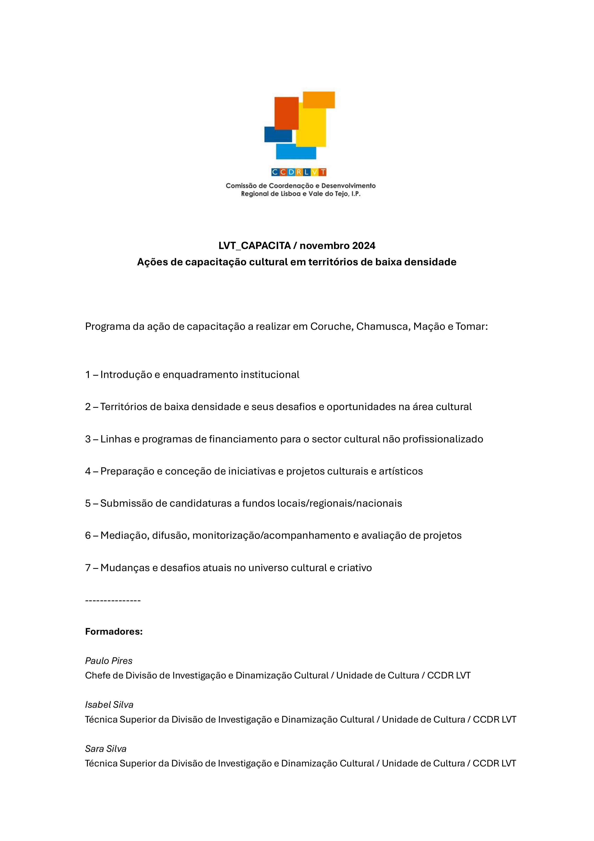 Nos próximos dias 25 e 26 de novembro de 2024, entre as 18h00 e as 21h00, a Comissão de Coordenação e Desenvolvimento Regional de Lisboa e Vale do Tejo, I.P., (CCDRLVT) promove uma ação de capacitação cultural, a decorrer no Centro de Apoio a Empresas. A ação é gratuita (limitada a 50 participantes), no entanto, carece de inscrição prévia através do e-mail: Este endereço de email está protegido contra piratas. Necessita ativar o JavaScript para o visualizar. .