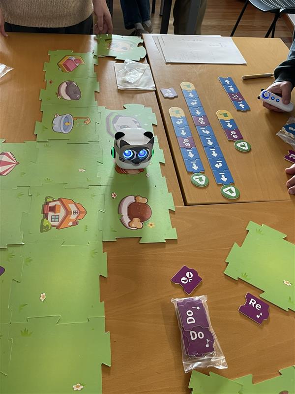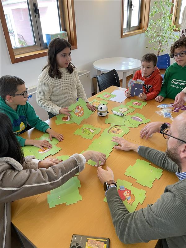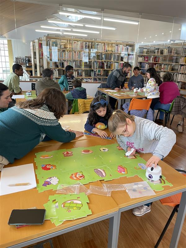 A atividade, dirigida a pais/cuidadores e filhos, contou com a presença do robô mTiny, que proporcionou uma experiência educativa e interativa. Durante a sessão, os participantes tiveram a oportunidade de explorar o funcionamento deste robô educativo, que estimula a aprendizagem e a criatividade, e introduz conceitos básicos de programação, lógica e resolução de problemas através do jogo.