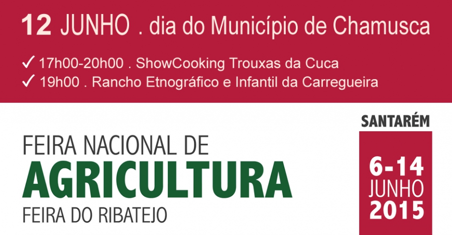 O Município de Chamusca estará presente na Feira da Agricultura 2015 através da Comunidade Intermunicipal da Lezíria do Tejo. Dia 12 de junho será o dia dedicado ao nosso concelho. Assinalado com o ShowCooking Trouxas da Cuca das 17h00 às 20h00 e com a atuação do Racho Etnográfico e Infantil da Carreguei às 19h00, despertará certamente, o interesse dos visitantes.