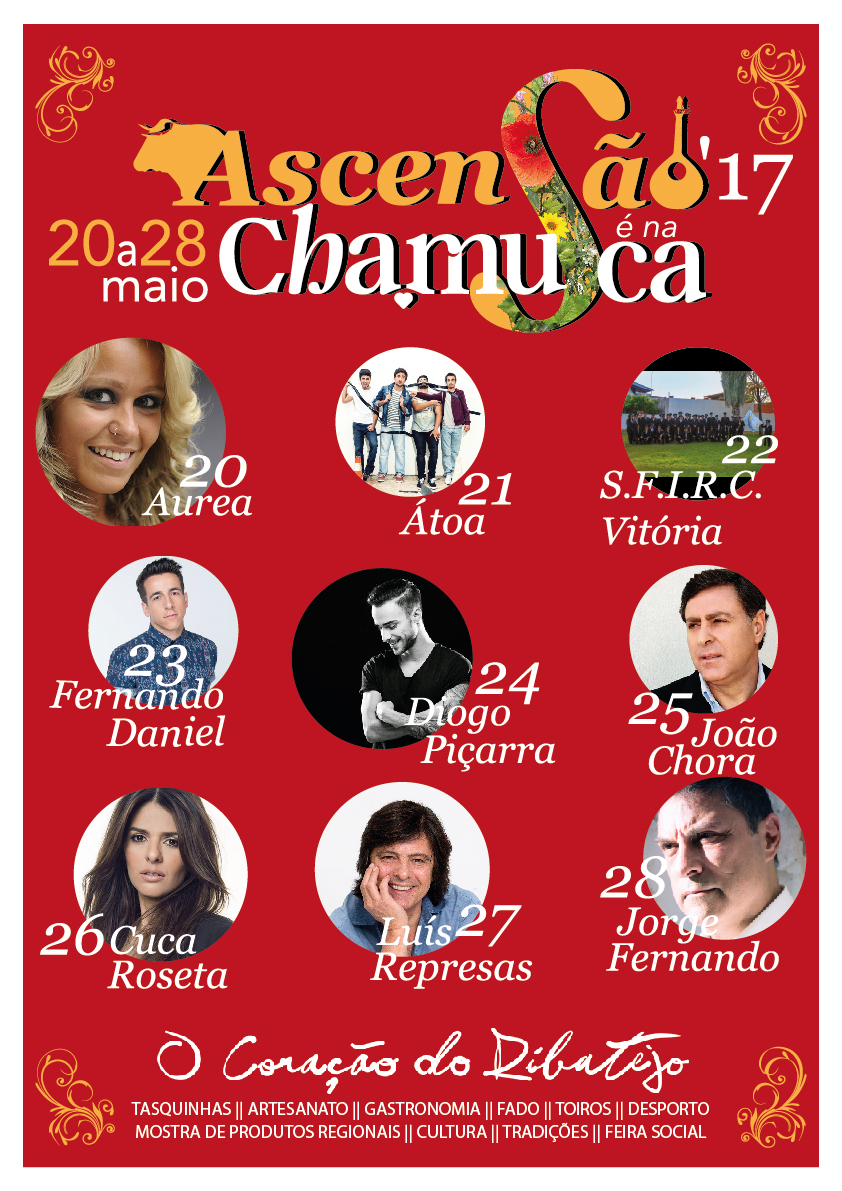 Página Principal > Serviço Ação Social > Agenda de Eventos > Ascensão 2017 | 20 a 28 Maio Partilhar Tweet Imprimir E-mail Lido 24875 vezes Ascensão 2017 | 20 a 28 Maio Fazer descarga de anexos: CMCZ-ZascensaoWEB_GERAL.jpg FeiraZTaurina.jpg