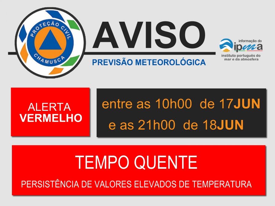 "Aviso VERMELHO para Santarém, para tempo quente - Persistência de valores elevados da temperatura máxima. Entre as 10:00 de 17Junho e as 21:00 de 18 Junho."