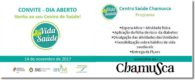 O Dia Aberto . Mais Vida Mais Saúde será assinalado no Centro de Saúde da Chamusca, numa ação conjunta que envolve a Unidade de Cuidados na Comunidade Chamusca/Golegã  e o Município da Chamusca, através dos seus Gabinete de Desporto e Serviço de Ação Social. A programação pensada é a seguinte: