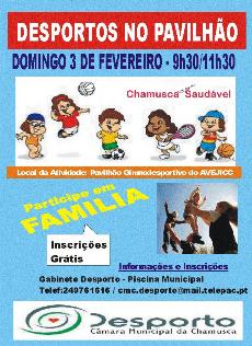 Domingo, dia 3 de Fevereiro, Chamusca - Um Concelho - Saudável, inscrições grátis, desportos de pavilhão, apareça e traga a sua familia, participe, viva saúde, mantenha-se ativo - Pavilhão Gimnodesportivo do AVEJICC-  entre as 9H30 e as 11H30.