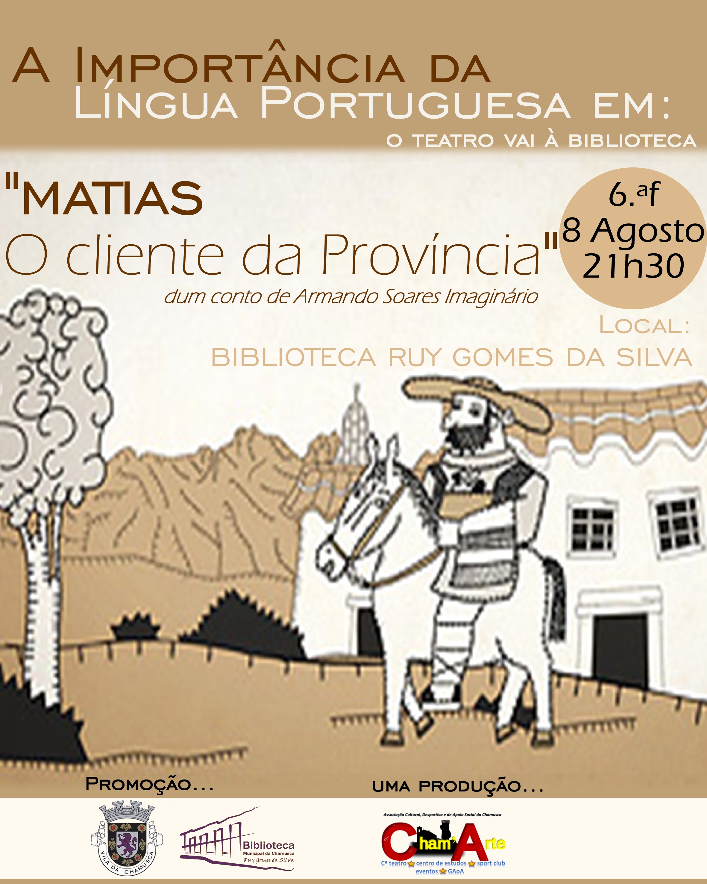 O Município de Chamusca em colaboração com a Cham'ArteAssociação Cultural, Desportiva e de Apoio Social da Chamusca, está a promover na Biblioteca Ruy Gomes da Silva durante os serões de Verão uma atividade intitulada “A Importância da Língua Portuguesa” a iniciativa surge no âmbito do projeto O Teatro vai à Biblioteca. A primeira exibição é está sexta-feira, dia 8 de Agosto a partir das 21h30 onde vai ser representado uma peça dum conto de Armado Soares Imaginário: “Matias O Cliente da Província”.