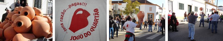“Quer saber o que é o Jogo do Quartão? Então é melhor explicar-lhe agora. É que daqui a nada já está tudo a falar sozinho!” Foi assim o nosso primeiro contacto com esta tradição secular, que acontece todas as Quartas-feiras de cinzas na Chamusca. Um grupo de homens passeia pela vila e vai lançando o cântaro ou o quartão. Pelo caminho vão parando de tasca em tasca, onde lhes é oferecida comida e bebida. A “paródia” começa logo a seguir ao almoço e só termina depois da meia-noite, com o Enterro do Galo.