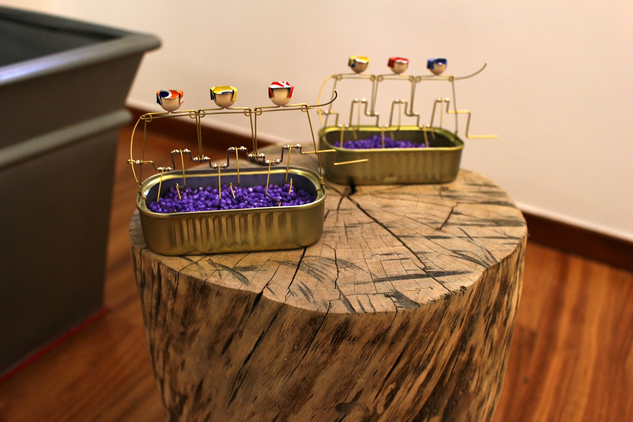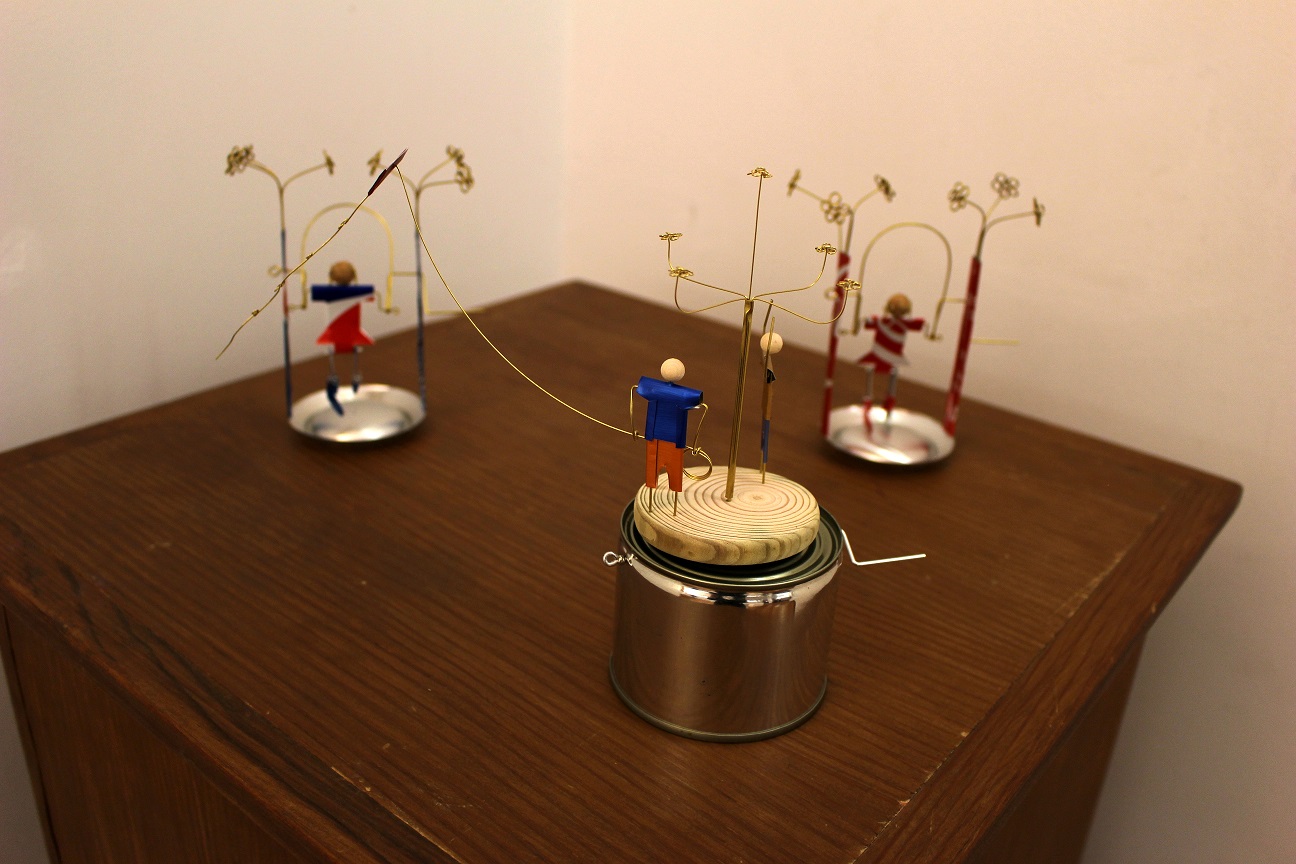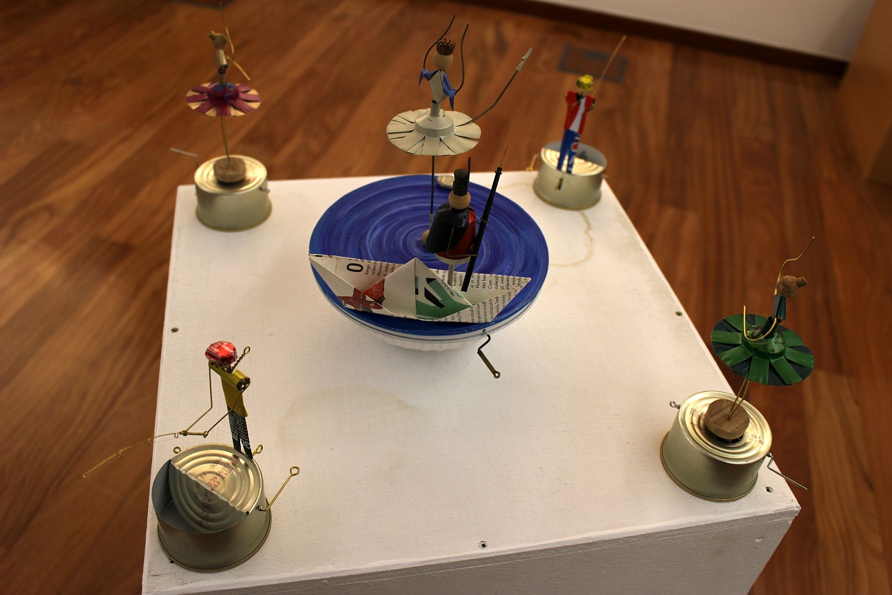 Caixotes de madeira, latas ou guarda-chuvas partidos, são transformados pelo artista, retratando brincadeiras de criança, atividades tradicionais, personagens de histórias conhecidas e outras histórias que ainda estão por contar.