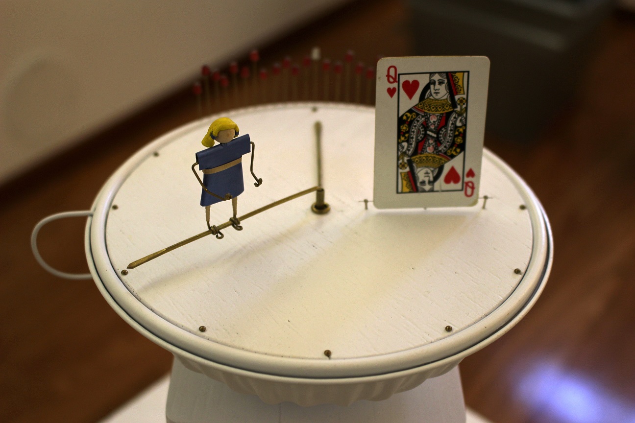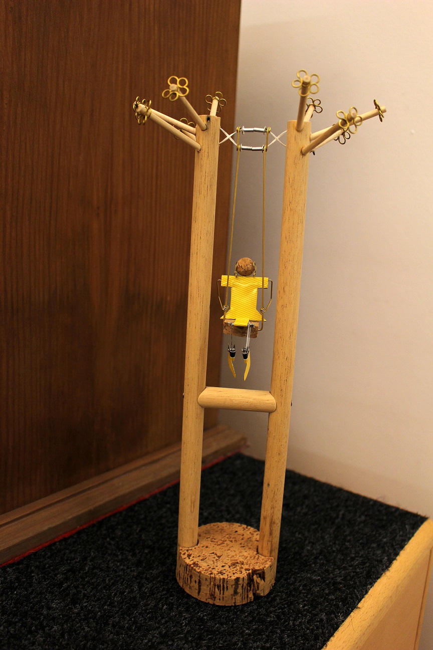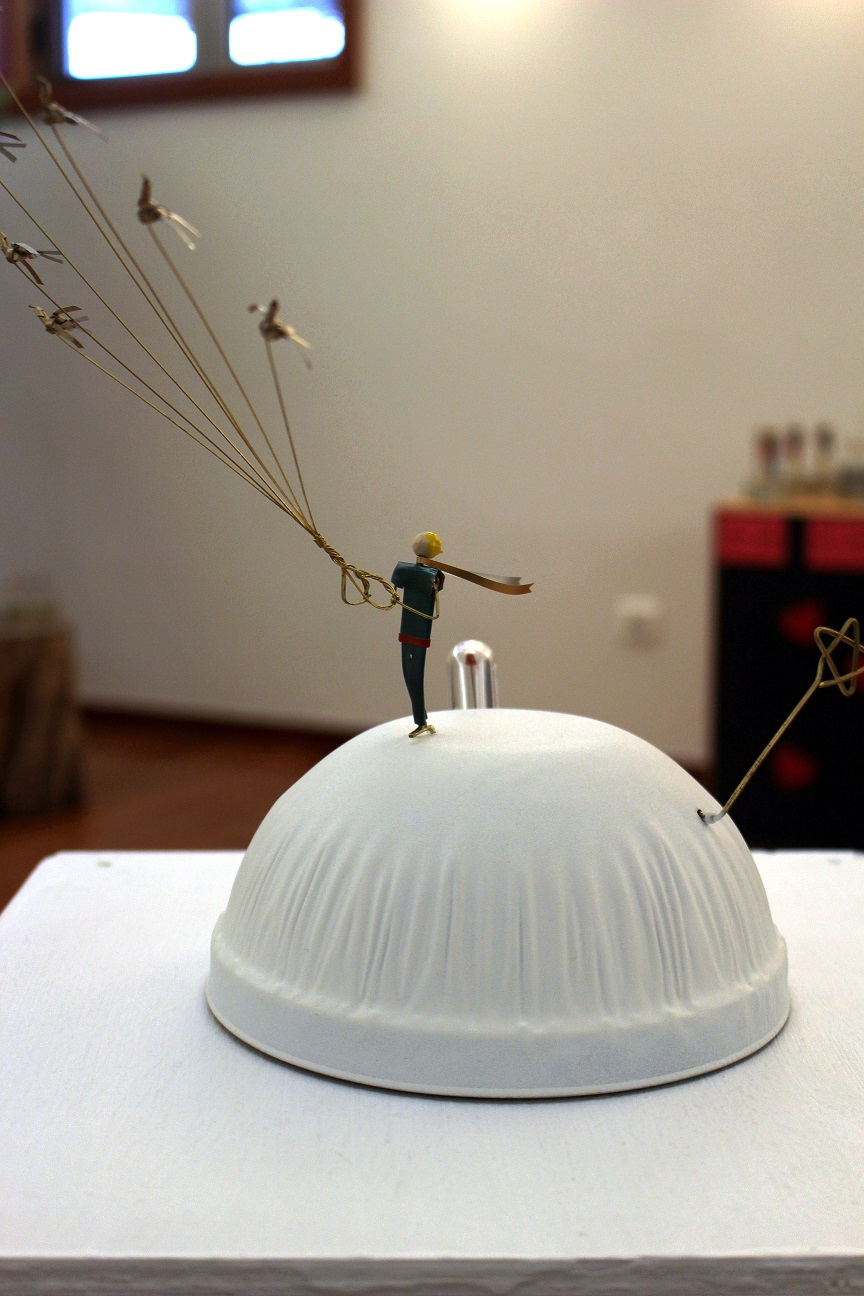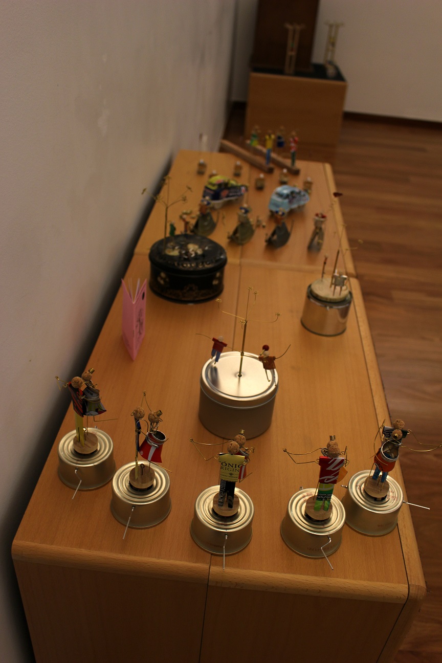 Caixotes de madeira, latas ou guarda-chuvas partidos, são transformados pelo artista, retratando brincadeiras de criança, atividades tradicionais, personagens de histórias conhecidas e outras histórias que ainda estão por contar.